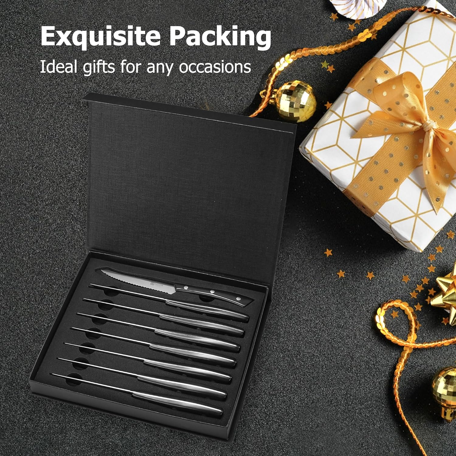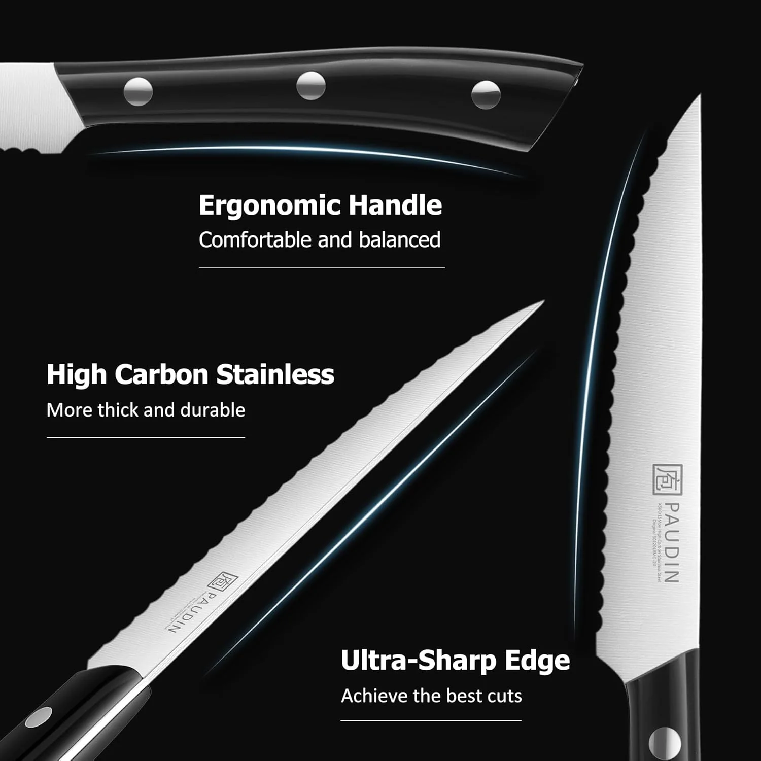 This PAUDIN steak knife set is designed for clean, precise cutting of steak and everyday meals. The 4.5” serrated blades cut smoothly with minimal sticking, making them ideal for family dinners, gatherings, and entertaining.